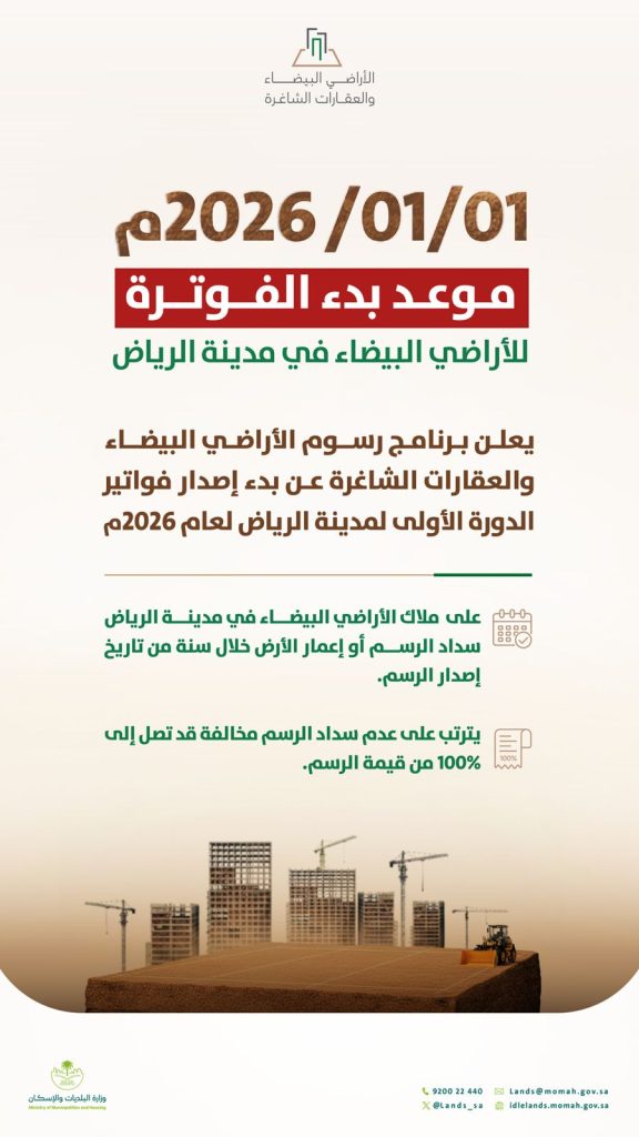 أعلنت وزارة البلديات والإسكان ممثلة ببرنامج رسوم الأراضي البيضاء والعقارات الشاغرة اليوم الخميس، عن بدء إصدار أكثر من 60 ألف فاتورة لرسوم الأراضي البيضاء في مدينة الرياض، وذلك امتدادًا لتوجيهات سمو ولي العهد – حفظه الله – الهادفة إلى تنظيم السوق العقاري وتحقيق التوازن بين العرض والطلب.